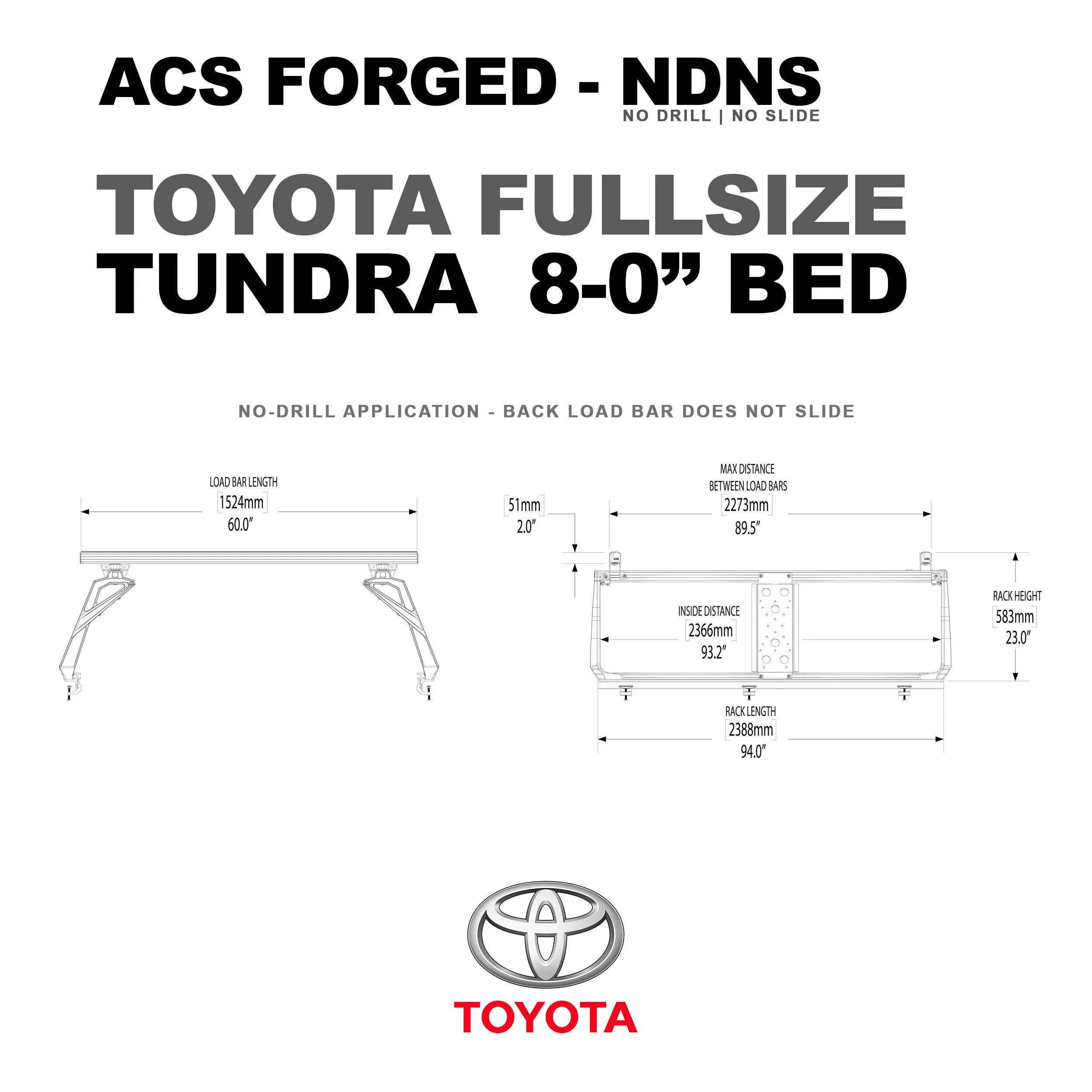 The ACS FORGED NDNS (No Drill / No Slide) is conveniently a “No Drill, 100% Bolt On” rack application. Being that it is strictly a bolt on rack, with the absence of the rear support arm, the rear sliding load bar functionality DOES NOT exist with this rack. This rack is intended for users who choose to either keep a Roof Top Tent, or other gear carriers permanently on their rack.
